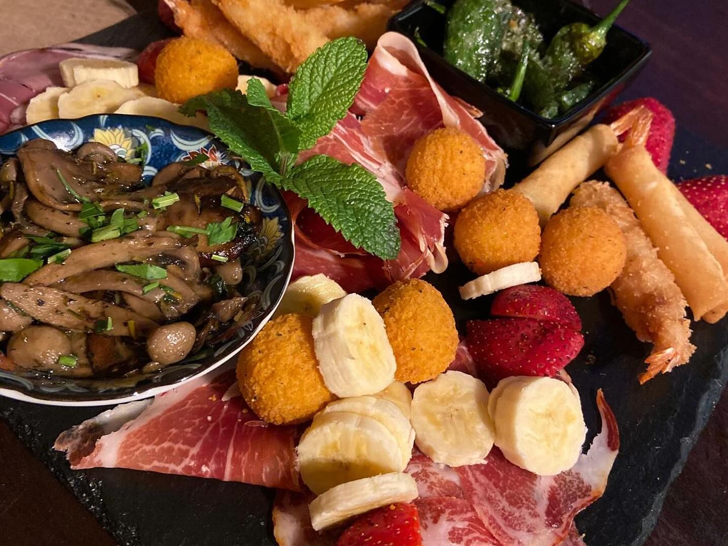 Tapas criativas e saborosas, como pimentos padrón, cogumelos salteados, bruschettas e outras delícias preparadas com ingredientes frescos e sazonais.